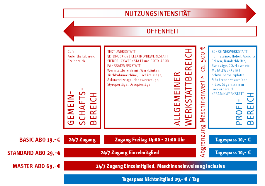 Für die Mitgliedschaft bei uns stehen Dir verschiedene Modelle zur Verfügung. Sie richten sich nach Werkstattbereichen und Intensität der Nutzung. Zusätzlich kannst Du die Werkstatt mit einem Tagespass auch ohne Mitgliedschaft nutzen. Für Initiativen, Selbstständige oder einfach nur einmalige Workshops finden wir individuelle Mietkonditionen.
